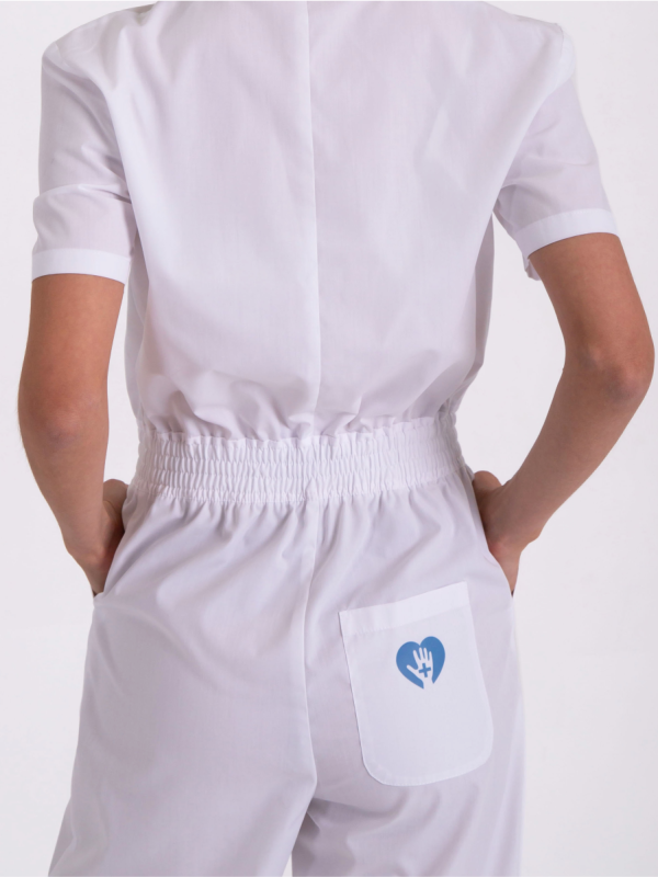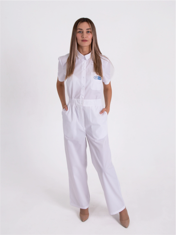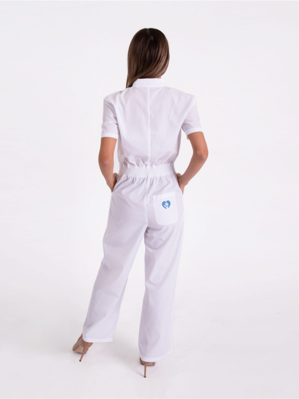 Белый медицинский комбинезон для профессионального использования. Изготовлен из смесовой ткани с защитными свойствами. Модель с застежкой-молнией и длинными рукавами. Комплектуется нагрудным карманом и регулируемым поясом. Прямой крой обеспечивает комфорт при работе. Сочетает функциональность и гигиеничность для медицинских учреждений.