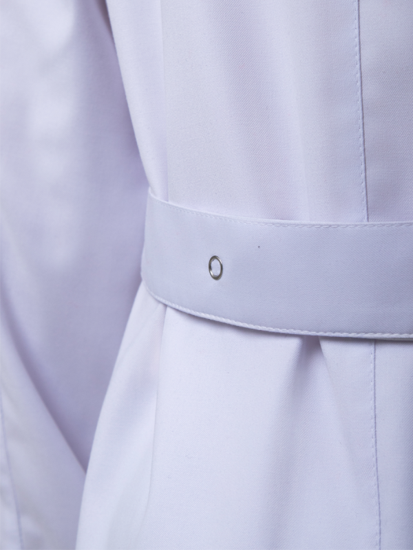 Белый медицинский халат для профессионального использования. Изготовлен из смесовой ткани с защитными свойствами. Модель с застежкой на пуговицах и длинными рукавами. Комплектуется двумя нагрудными карманами. Прямой крой обеспечивает комфорт при работе. Сочетает функциональность и гигиеничность для медицинских учреждений.