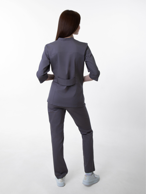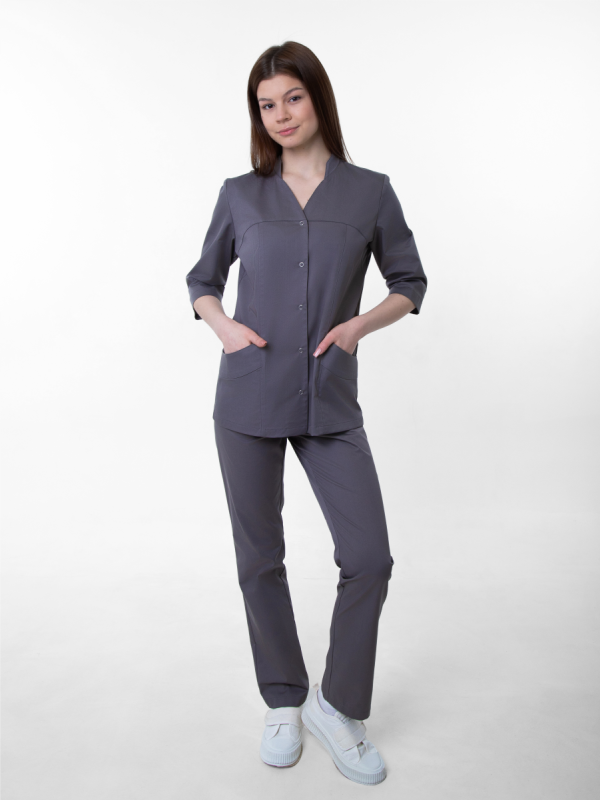 Серый медицинский комплект для профессионального использования. Изготовлен из смесовой ткани с защитными свойствами. В комплект входит куртка на молнии и брюки на резинке. Функциональные детали включают нагрудный карман и регулируемые манжеты. Прямой крой обеспечивает комфорт при работе. Сочетает практичность и гигиеничность для медицинских учреждений.